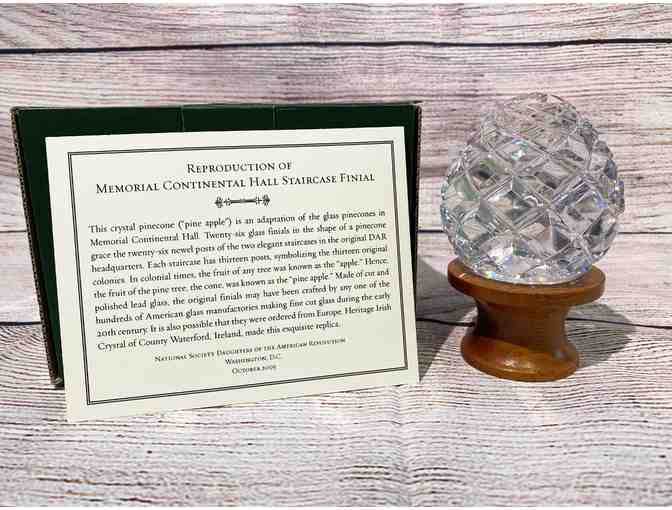 This crystal pine cone ("pine apple") is an adaptation of the glass pinecones in Memorial Continental Hall. Twenty-six glass finials in the shape of a pinecone grace the twenty-six newel posts of the two elegant staircases in the original DAR headquarters. Each staircase has thirteen posts, symbolizing the thirteen original colonies. In colonial times, the fruit of any tree was known as the "apple." Hence, the fruit of the pine tree, the cone, was known as the "pine apple." Made of cut and polished lead glass, the original finials may have been crafted by any one of the hundreds of American glass manufactories making fine cut glass during the early 20th century. It is also possible that they were ordered from Europe. Heritage Irish Crystal of County Waterford, Ireland, made this exquisite replica.