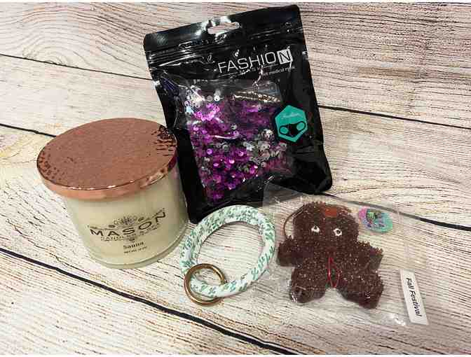 Purple Sequin Mask, Car Freshie, Cactus Key Chain, and a Mason candle