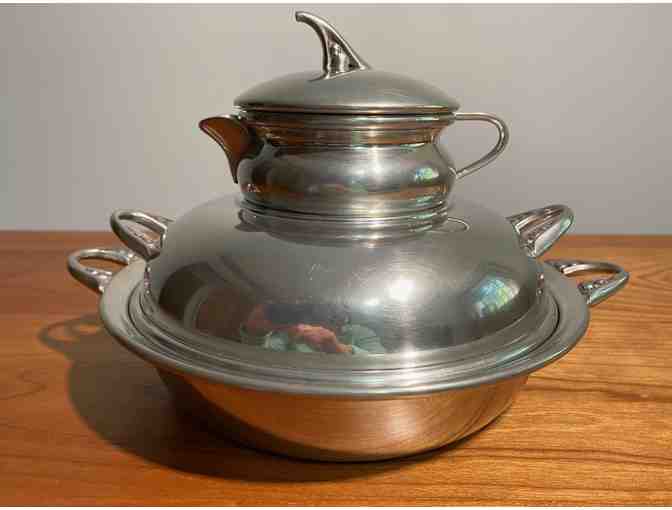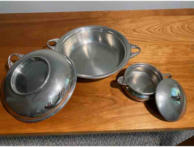 Forming the base of the Pewter Warming Dish is a round bowl 6.75 inches in diameter (without the handles) and 1.5 inches deep. You fill this bowl with hot water, and cover it with the convex lid with handles that match the base handles. In the center of the lid is a circular indentation 2.75 inches in diameter and one-quarter inch deep. Into the indentation, you put the small pitcher with lid that can contain milk, maple syrup, bearnaise sauce, or any other liquid. The hot water in the base ensures that the liquid in the pitcher on top is kept nice and warm all through the meal.