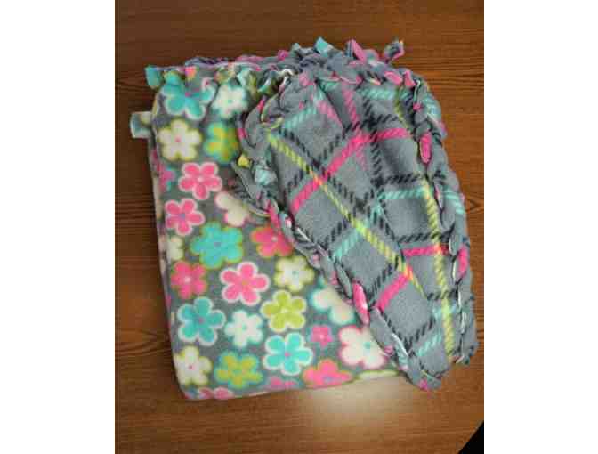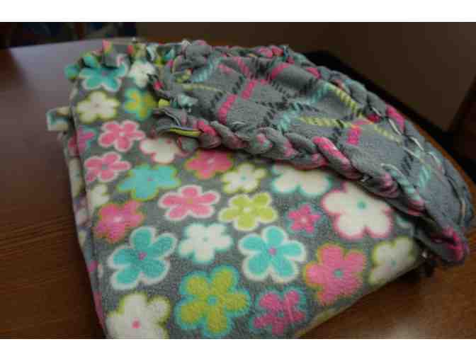 Handmade fleece blanket with pink/lime green/aqua colored flowers with a gray background