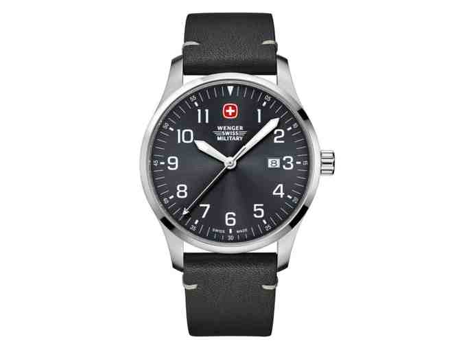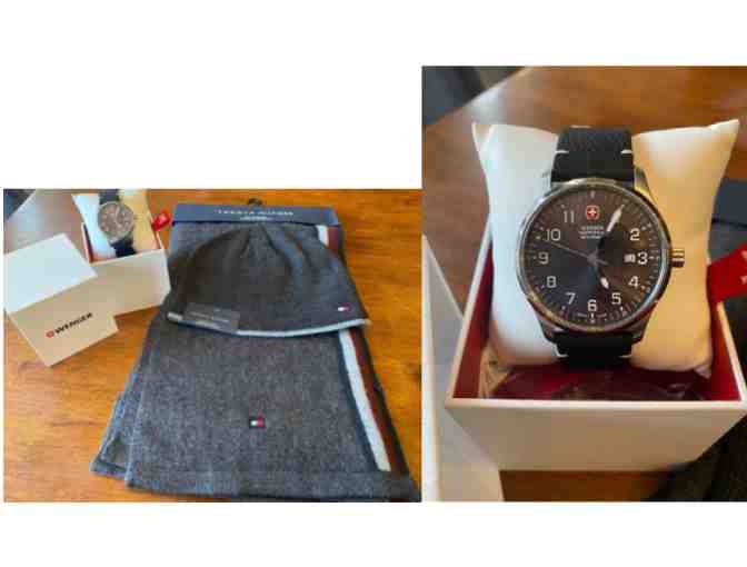 This set includes an authentic Swiss-Made Wenger Military Watch, with dark gray face, silver-tone hardware and black leather adjustable band. This watch is valued at $175.00. This set also includes Tommy Hilfiger men’s hat and scarf ($98.00 value).