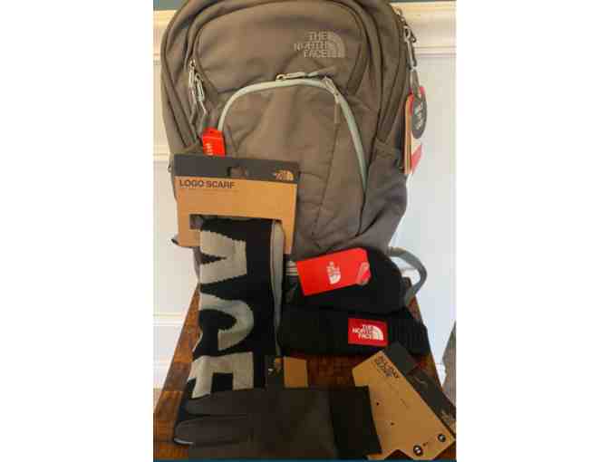 A variety of North Face quality accessories, perfect for the upcoming season! This package includes: The North Face multi-use, full-size gray backpack, with pale blue zipper/lining and multiple interior and exterior pockets and strap (value $79), The North Face black & gray logo scarf ($50 value), A pair The North Face “All Day” unisex winter gloves - size large ($35), And a warm & cozy The North Face fleece-lined black beanie hat ($26 value)