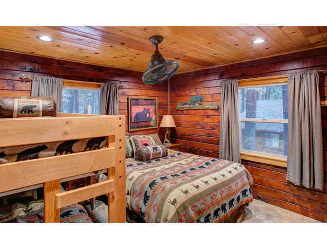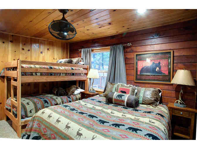 The Yosemite Getaway is a pristine, silver-rated cabin, that sleeps up to 6 guests and has 2 bedrooms and 2 bathrooms. The fully-equipped kitchen boasts granite countertops, stainless steel appliances, a dishwasher, and a Keurig coffee maker. This home features new flooring, updated decor, ceiling fans, forced air heat, and a river rock fireplace (wood provided in season). Modern details include a granite desk with a charging station, a flat screen satellite TV, and WiFi. The comfortable master bedroom includes a king bed, a cozy window seat, and an attached 3/4 bathroom. The second bedroom sleeps four with a queen bed and bunk beds. The main, updated full bath has granite countertops with bronze fixtures, and the living room provides a queen hide-a-bed. The spacious, enclosed, private deck has a gas BBQ for grilling, exterior lighting, and patio furniture for dining and lounging under the stars.