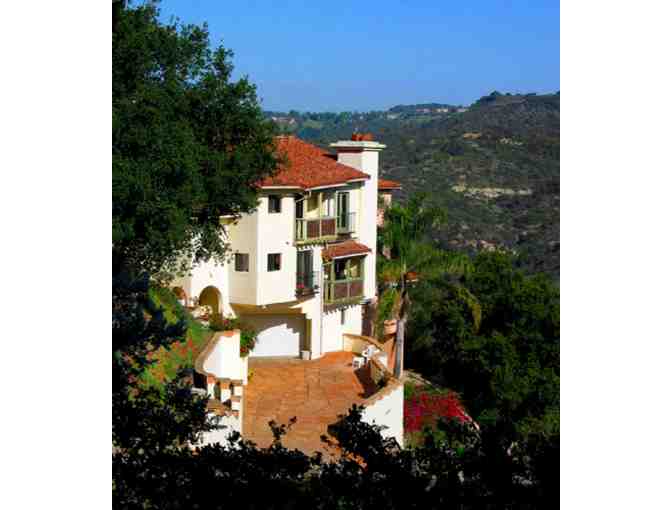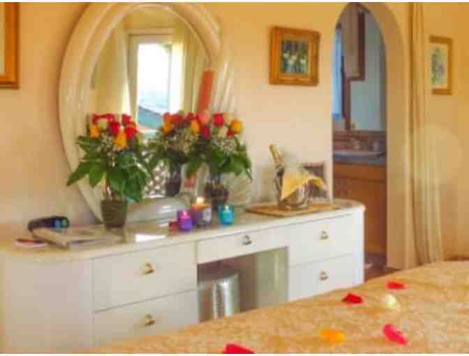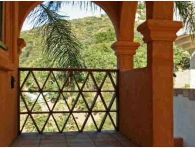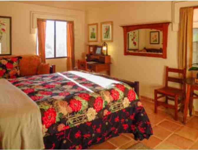 Located in free-spirited Topanga Canyon, west of Los Angeles, the Inn is about one mile off busy Topanga Canyon Boulevard and about 400 feet up a private road. The Inn comprises two Mediterranean-style buildings, the Casa Blanca, the white house, and the Casa Rosa, the rose-colored house. Our constantly growing collection of antique Craftsman furniture graces the living rooms, the dining rooms, and some bedrooms. California Plein air paintings by your hostess, Elena Roché, and fine art nature photography by Catherine Roché are exhibited throughout the Inn and many are available for sale. This certificate Applies to the Sylvia and Ramon room, the Nick and Nora room, or the Bogey and Bacall room.
