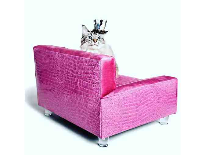 Otto's Empire dog bed- Bubblegum-pink velvet with pink faux croc back, crystal buttons and clear acrylic legs