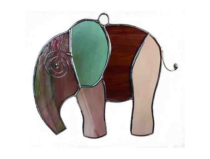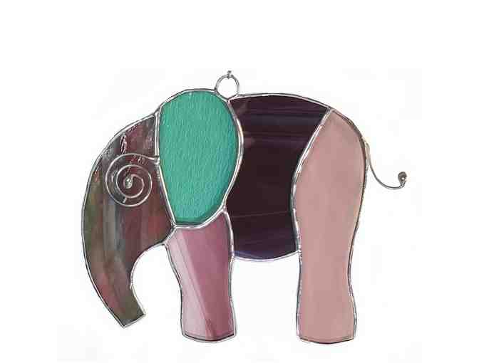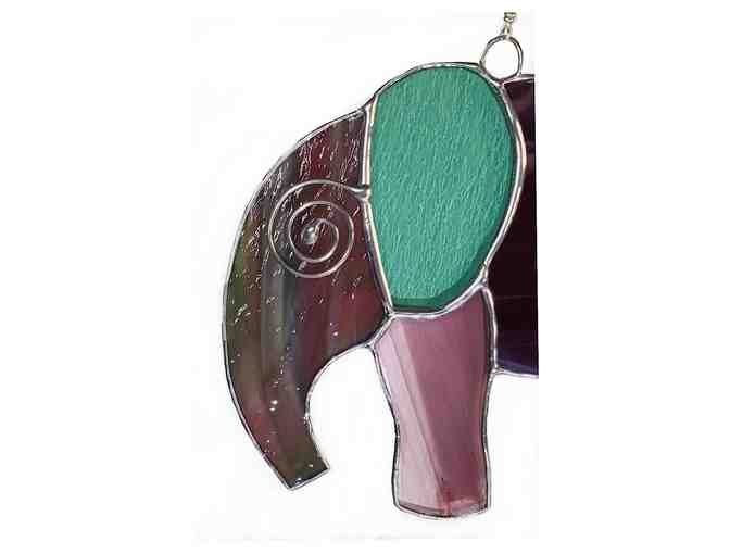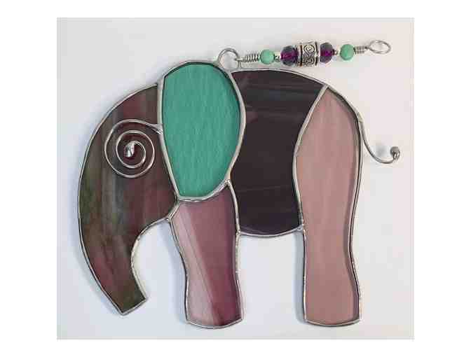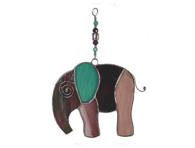 Celebrate your love of elephants with this gorgeous hand-made artisan stained glass elephant suncatcher. It has 5 different pieces featuring different shades of green, rose, wine and plum varying in opacity and texture that does not always come through in the pictures...you have to see it hanging against a window or light to truly appreciate its beauty. It has gorgeous design elements like the whimsical swirl eye and tail and a coordinating beaded wire from which to hang it.