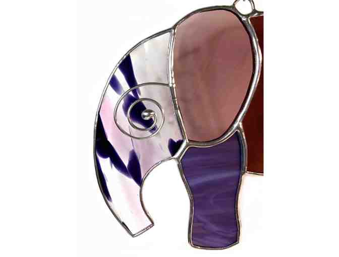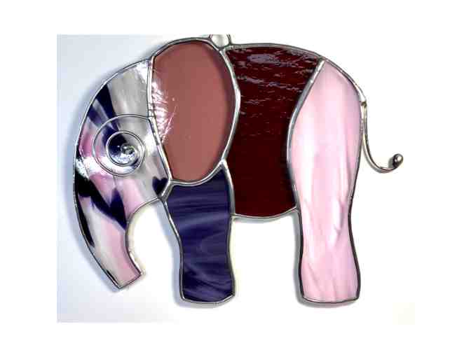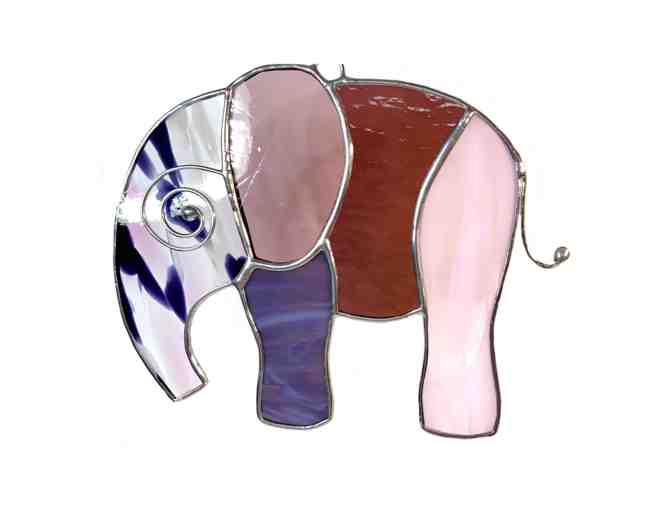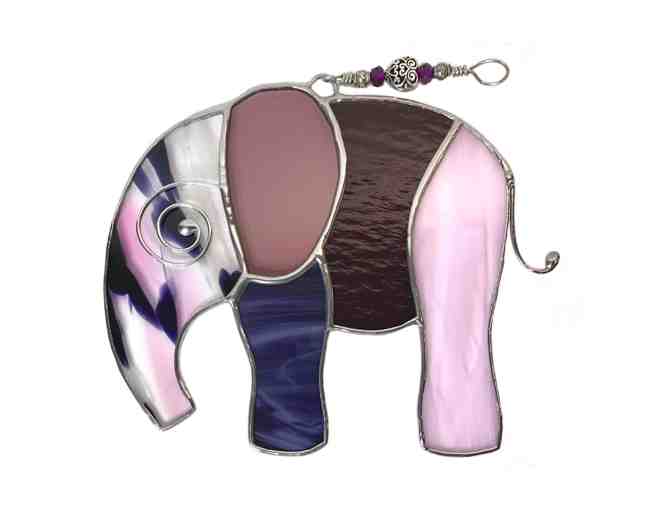 Celebrate your love of elephants with this gorgeous and unique hand-made artisan stained glass elephant suncatcher. It has 5 different pieces featuring different shades of pink, rose, purple and plum varying in opacity and texture that does not always come through in the pictures...you have to see it hanging against a window or light to truly appreciate its beauty. It has gorgeous design elements like the whimsical swirl eye and tail and a coordinating beaded wire from which to hang it.