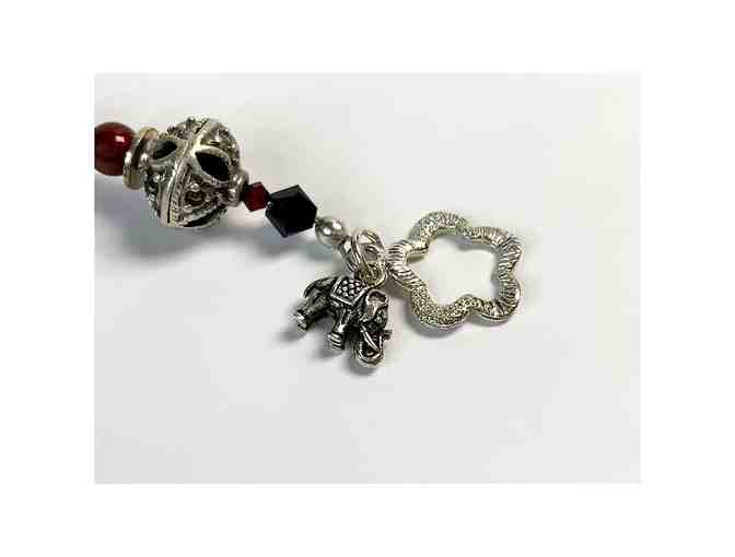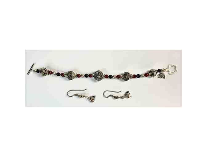 This beautiful sterling silver set truly celebrates elephants and is entirely handmade using traditional artisanal Indian style elephant charms and earrings. The bracelet features genuine Swarovski pearl beads in burgundy, jet and platinum and silver marcasite beads that complement the sterling silver elephant charm, both in the traditional Indian artisan style. It has a sterling silver toggle clasp and measures approximately 7 inches, perfect for a small to medium wrist.