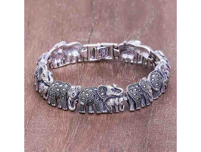 This stunning 925 sterling silver bracelet is designed and hand-crafted by Thai artisan Narinee who has a special fondness for marcasite, with its tiny facets and subtle glimmer. She showcases the gemstone in this original bracelet, with links that form a parade of elephants, both large and small. The sterling silver bracelet is secured by an ornate fold-over clasp. It weighs 1.06 oz and measures 7" long and 1.2 cm wide (0.5") wide. This special piece truly celebrates the beauty of wild matriarchal elephant societies and will serve as a conversation starter to promote awareness of their plight.