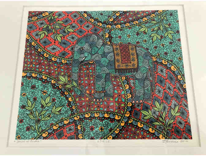 From the artist: "I fell in love with the rich vibrant colors and intricate designs gracing the buildings, textiles, and artwork while I was in India. In India and elsewhere the elephant has long been revered as a symbol of good luck and good fortune. It also represents power, dignity, intelligence, and peace. According to Indian mythology the elephant is one of the nine jewels that surfaced when the oceans were churned by gods and demons seeking the elixir of immortal life. Ever since, elephants have been considered precious, and must be preserved and protected. This inspired my artwork "Jewel of India"