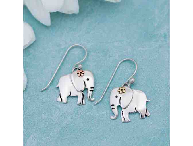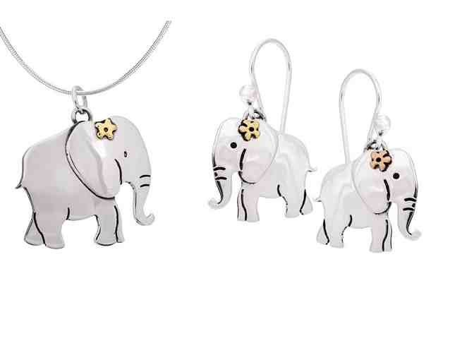 Pay homage to these gentle giants with an artisan-made bright shining sterling silver pendant and earring set that touts your love of the floppy eared, big-spirited elephants. The pendant measures 0.8 x 0.9 inches and the ellie is adorned with a cute brass flower. It comes on an 18 inch sterling silver snake chain. The earrings measure 0.9 x 0.6 inches. They are made of sterling silver with an adorable brass flower on one and copper flower on the other. They are handcrafted and fairly traded from Mexico.