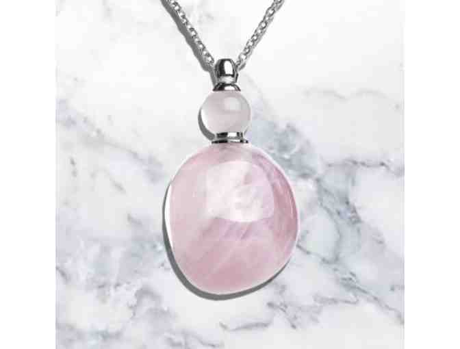 This unique aromatherapy ROSE QUARTZ necklace is not only stylish but will promote calm and balance within you. It also comes with a tiny dropper for you to put 3 to 4 drops of essential oils to use throughout the day as you need. It has a screw top and hangs from a silver plated 30 inch chain. The pendants vazy somewhat in size and shape but are similar to the stock image posted here. They are approximately 1.5 to 1.75 inches.