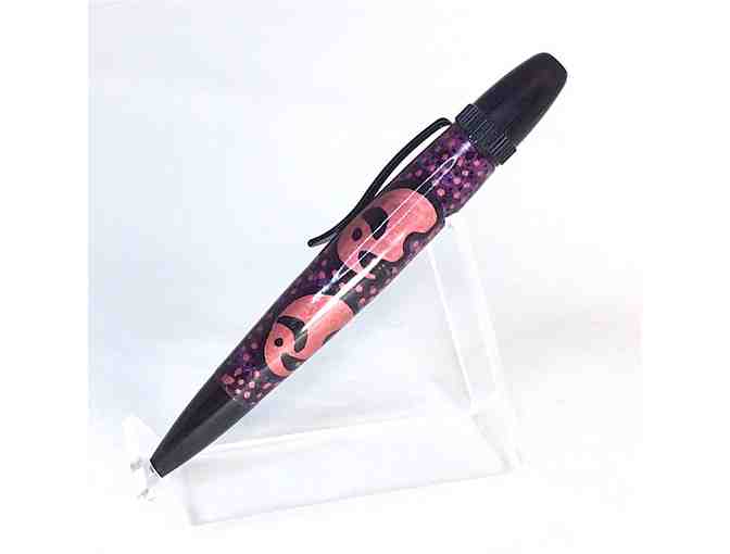 This is the Carbara Twist Pen in black chrome hardware which he turned with a fairly wide body which makes it great for people with arthritis. The body is curly maple which I stained violet and then decorated it with stylized little metallic pink ellies on both sides. The ellies pop out of the background which has been decorated with dots of pink and black. It's bright, fun and, best of all, it's all about your love of pachyderms!
