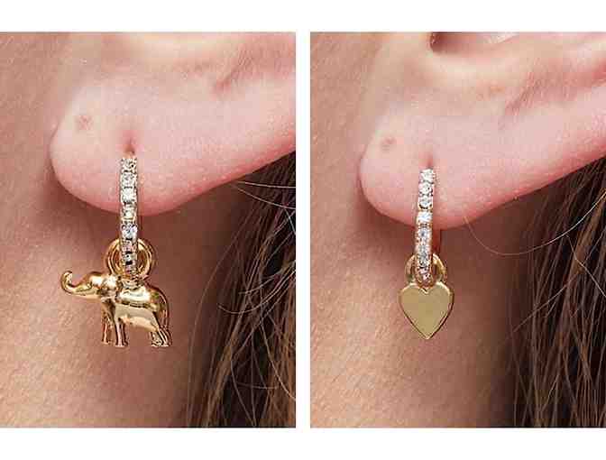 These are extremely versatile 3-in-1 earrings. You can keep it simple with 'huggie' pave crystal hoops that are made of gold-plated pewter. Or you can switch it up and change your look by adding either the adorable elephant or heart charm.