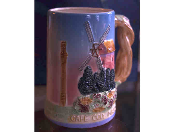 A mug to remind you of days spent on Cape Cod with a lighthouse, windmill and the Pilgrim Monument. Ornate and three dimensional with twisted twig handle! For Coffee, tea or as a stein for beer. 5 inches tall.