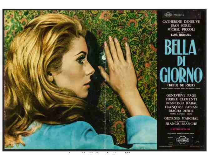 Catherine Deneuve looks through the peephole; great image for classic Bunuel film.