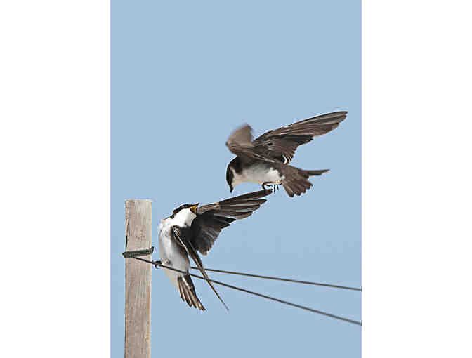 Photographed by the late Evan T Lawson, former President of the Provincetown International Film Festival, this is an 8.5"x11" color archival print (approx. 14"x17" framed ). The photo captures a pair of squabbling Eastern Kingbirds (circa 2000) as they make their seasonal migration through Provincetown.