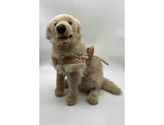 Welcome this delightful golden retriever plush dog into your life and he will bring you joy for years to come. "Chase," who is sitting with his toy leather harness, is a stunning replica of our dedicated working goldens here at The Seeing Eye. His adorable face and fluffy softness makes him a hugable, lovable companion for you!