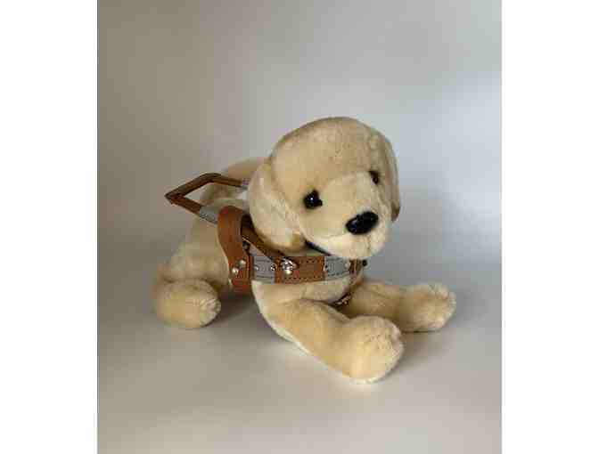 Be one of a select few to own a Seeing Eye Yellow Labrador Retriever plush with a handmade harness! This soft-furred Lab plush has dark eyes and a velvety black nose. Its ears are perked up at attention and it is awaiting its owner's instructions. A red bandana with The Seeing Eye's logo printed in gold metallic ink adorns the dog's neck.