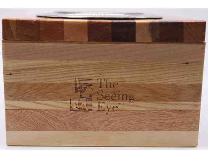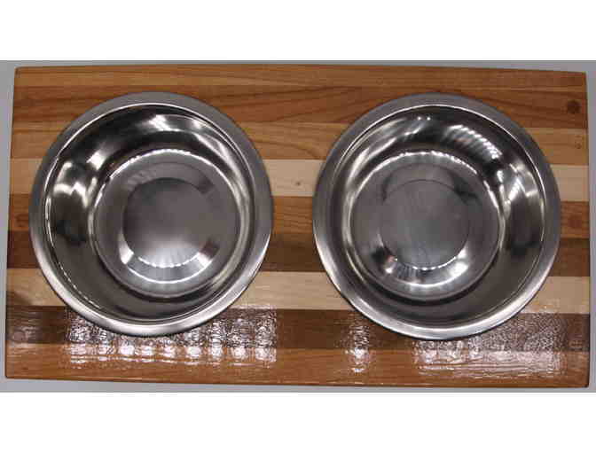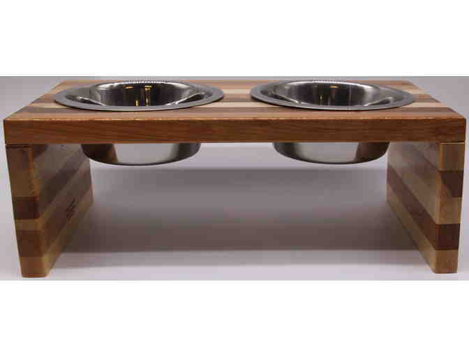 Have your dog eat in style with this creatively designed all-wood feeding table. Made from an attractive combination of light, medium and dark-finished striped American hardwoods, this veterinarian-made table holds two one-quart bowls and measures 16 inches x 9 inches x 6 inches. Eating from the table will especially help any dog suffering from arthritis, digestion or musculoskeletal system issues.One side contains The Seeing Eye logo masterfully burned into the wood. Treat your pup to this formal dining experience!