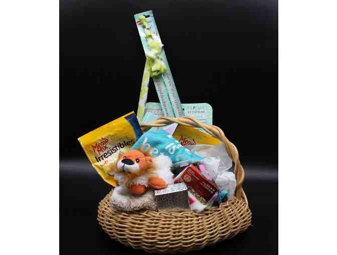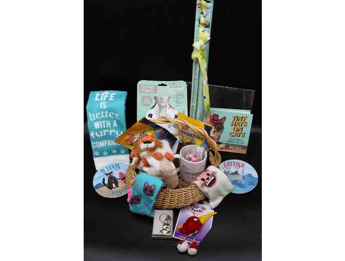 This adorable basket is filled with treats for both you and your kitty, including: a Fleece Frenzy cat wand, 2 cat plates - one has a black cat with a whistle around his neck sitting next to a life guard buoy and says “9 Lives to the Rescue”, and the other one is a cat swimming in water with a shark fin on its back and a snorkeling mask and says “CatFish”, an adorable cat faced outlined coffee mug with the words “Catfinated”, two pairs of women’s fashion socks (one pair is blue with pink and grey kitten faces and the other pair are white with pink kitty faces), super soft lion plush fleece socks, stunning momma cat and kitten silver key chain, 2 bags of Meow Mix Irresistibles soft kitten treats, a Fed-up Fowls Hummingbird soft cat toy, a “Life is better with a furry companion” (light blue with white lettering and trim) kitchen towel, and then, to add that special touch: the book – Tiny Hats On Cats – pictures and step-by-step instructions on how to create 36 different hats – one for every occasion – from party hats and fedoras to hats fit for safaris and for solving crimes! Finally, when you are all done playing together, you can cool down with a super cute “cool cat” designed cooling towel (white towel with black and peach cats and black lettering). Just wet, squeeze, shake and then wear as a head band, head wrap or around your neck for a cooling and soothing effect. Can use again and again and will stay cool for over 2 hours when wet!