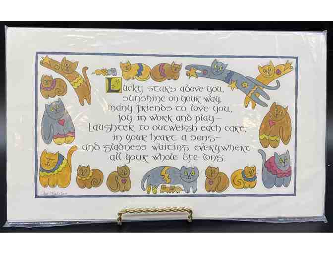 Celebrate your love of cats by displaying this limited-edition watercolor print with 19 fun loving cats framing the following blessing: "Lucky star above you, sunshine on your way, many friends to love you, joy in work and play - Laughter to outweigh each care, in your heart a song - and gladness waiting everywhere, all your whole life long".