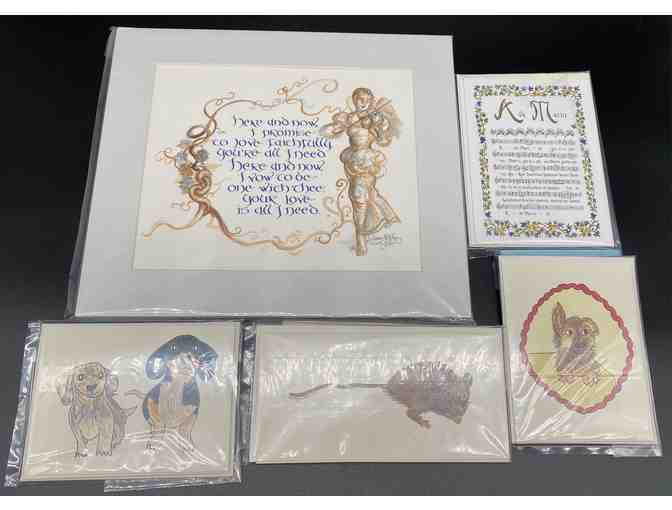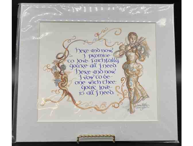 Celebrate music and love with this limited-edition unframed watercolor print of an angel playing violin with lyrics from a Luther Vandross song written in blue calligraphy on a cream background: "Here and now, I promise to love faithfully. You're all I need. Here and now, I vow to be one with thee. Your love is all I need." (measuring 10" x 8"). Included in this package are various notecards: