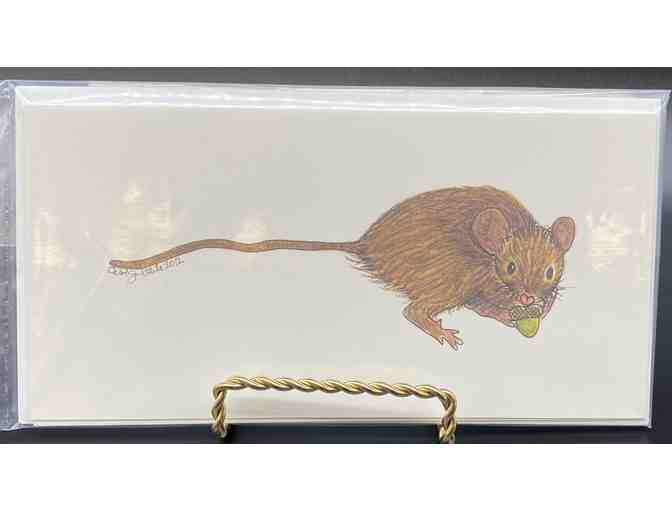 - Brown mouse with long tail holding acorn between front paws (measuring 7.25" x 3.5")