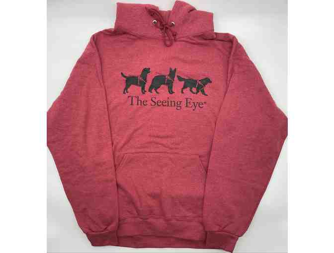 Wear your Seeing Eye hoodie around town and let everyone know where your heart lies! This lightweight red pullover is composed of 50/50 cotton/poly blend making this hoodie comfortable for any day of the year. All three Seeing Eye breeds in harness are printed in silhouette on the front of the hoodie: Labrador, German Shepherd and Golden. The words The Seeing Eye and the dogs are printed in black on the soft heather red sweatshirt. Proclaim your love for The Seeing Eye without saying a word.