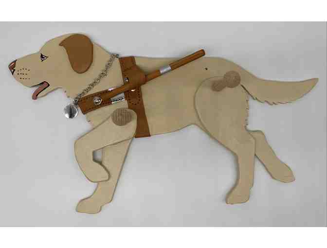 Brighten up your mud room with a handmade wooden leash rack in the shape of a Seeing Eye puppy. This Yellow Labrador retriever pup leash and harness rack is jigsaw cut from birch plywood, hand painted and fitted out with two 3” oak shaker pegs. The pup proudly wears the Seeing Eye's puppy raising vest. The pup's head looks face-on with open mouth and features two and three ply sculpted ears, nose and muzzle. His/her near legs are two ply, made to look like the pup is walking. The puppy wears a chain collar which has a wooden tag attached to it ready for you to personalize with your own dog’s name.