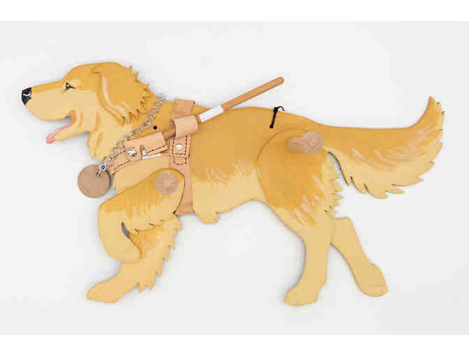 Brighten up your mud room with a handmade wooden leash rack in the shape of a Seeing Eye® dog. This golden retriever dog leash and harness rack is jigsaw cut from birch plywood, hand painted and fitted out with two 3” oak shaker pegs. The dog proudly wears the Seeing Eye's harness in leather with a wooden handle. The rack will hold leashes or harnesses and the harness handle can be used to hold keys. The dog's head is side view, open mouth and features two ply sculpted ears. His/her near legs are two ply, made to look like the dog is walking. The dog wears a chain collar which has a wooden tag attached to it ready for you to personalize with your own dog’s name.