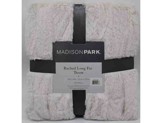 Cuddle up and stay warm with the Madison Park ruched faux fur throw blanket. Add a luxurious touch of style to your bed or couch with this ivory colored throw. Made with 100% polyester, the softness of the faux fur is unmatched.