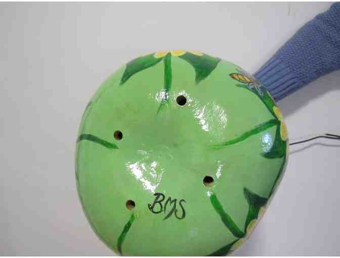 What bird wouldn't love this beautiful light green gourd is painted with yellow sunflowers and bees. The entrance to the house is the center of a large sunflower!