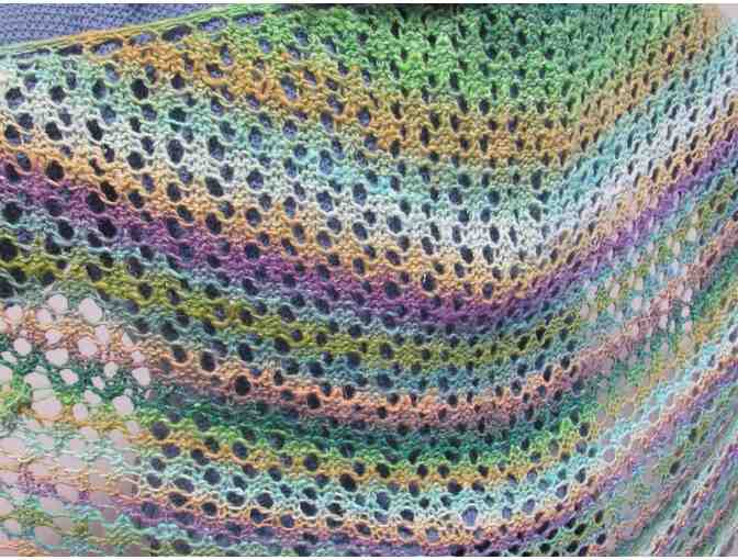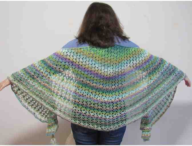 This beautiful hand knit, crescent shaped shawl has a delicate floral pattern in Koro wool and silk yarn. The colors range from indigo, lavenders, mint green to peach. A perfect shawl to dress up for a garden party or wear with jeans on a night out to dinner.