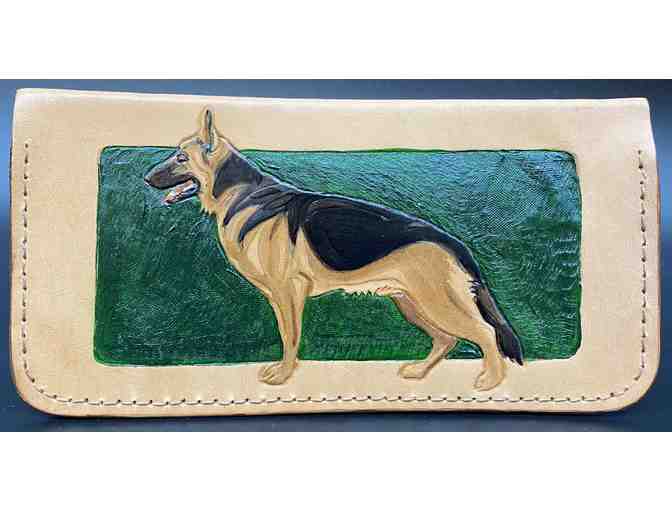 This is not your typical hand tooled leather wallet! With the image of a German Shepherd etched on the cover, its simple, easy-to-use interior is comprised of pockets for credit cards and money. Designed and hand made from high quality, durable leather by Artist Hava Hegenbarth, who does all the carving, tooling, and dyeing personally.