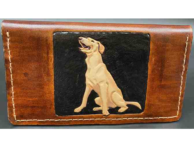This is not your typical hand tooled leather wallet! With the image of a Yellow Lab etched on the cover, its simple, easy-to-use interior is comprised of pockets for credit cards and money. There is a paw print etched on the inside pocket. Designed and hand made from high quality, durable leather by Artist Hava Hegenbarth, who does all the carving, tooling, and dyeing personally.