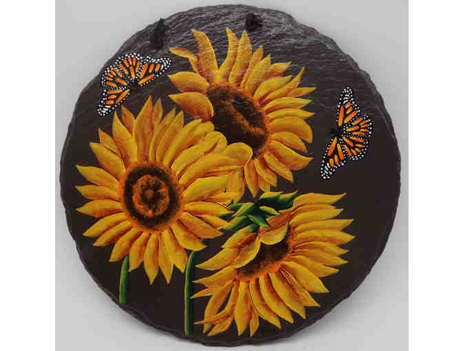 Brighten up any wall or outside garden with this lovely sunflower and monarch butterfly artwork! Skillfully hand painted on a ten inch round dark gray slate, this plaque displays a cluster of three bright yellow and orange sunflowers, with their green stems, in full bloom surrounded by two monarch butterflies showing off their beautiful black, orange and white pattern. The slate can be hung using the leather rope hanger that is thoughtfully built into the slate.