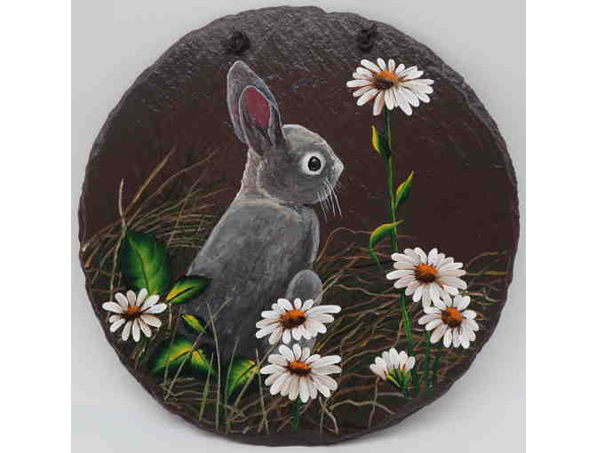 Hippity-hoppity this adorable bunny should be on its way home to you! Masterfully hand painted on a ten inch round dark gray slate, the profile of a gray bunny complete with large pink ears, beautiful black round eyes and white whiskers, is displayed while he sits upright in a high grassy meadow surrounded by seven white daisies with yellow flower heads in their centers. The flower stems and leaves in assorted shades of green complete the scene. Display your new artwork with the leather rope hanger that is included at the top of the slate.