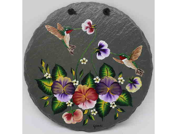 Be reminded of summertime all year long with this beautifully hand painted decorative slate. Two graceful bright green hummingbirds with white breasts and wings are enjoying a summertime pollen treat complements of an array of red and purple pansies in full bloom. The flowers are nestled within a sea of deep green and yellow colored leaves and small white flowers. The birds are flying above the flowers with their delicate wings fully open. The artwork is painted on a ten inch round dark gray slate and comes complete with its own leather hanging rope right on top.