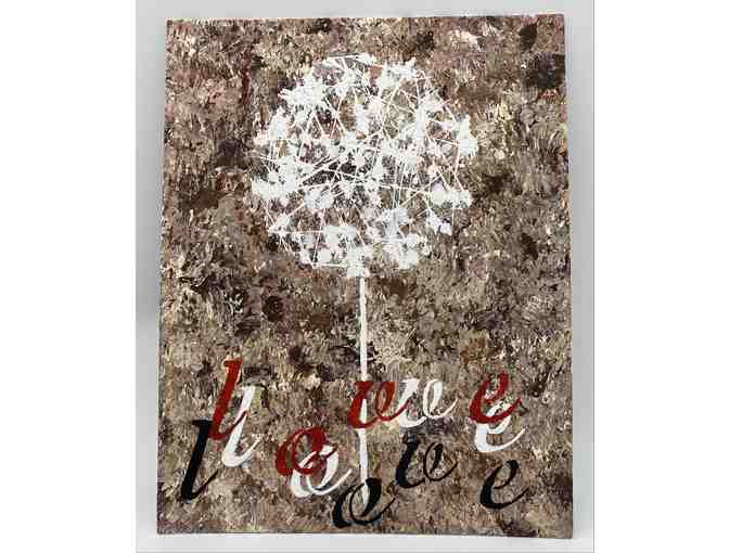 This is a must have for any music room or quirky gardeners! Will quickly become a gorgeous and wry conversation piece! Beautiful hand painted artwork featuring a white Dandelion and the word LOVE (in black, white and red lettering) created using only drumsticks!