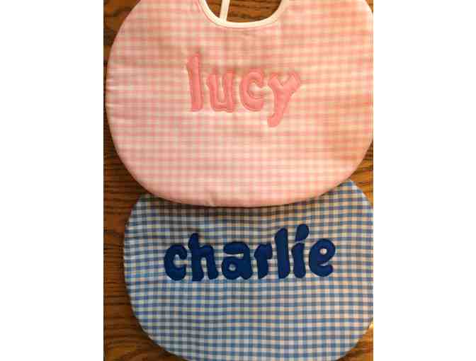 Auction winner will receive twelve 8” baby bibs of your choice, from over 450 fabrics, personalized with the baby’s first name. All names are appliquéd in lower case as shown in the two samples.