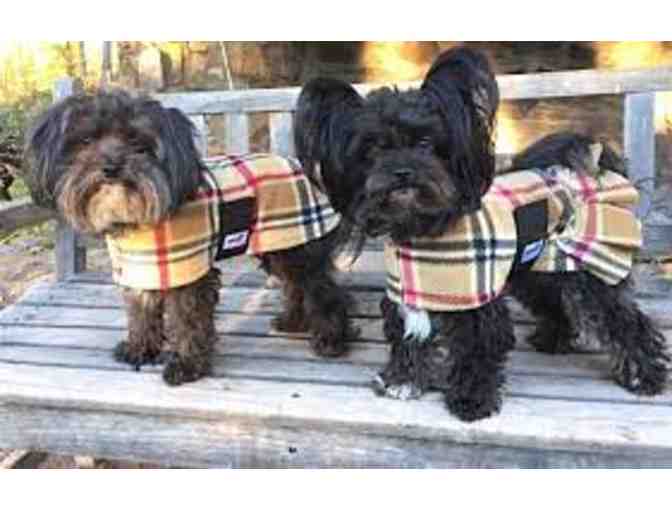 Coats for every breed, in every size. You can choose from the many fleece fabrics available, such as plaids, leopard print, houndstooth, argyle, tie dye, Grateful Dead, tartan,shark prints, anchors away to name only a few. This coat velcros across the dog's tummy and covers the top and chest of your dog. There is also a version with an added ruffle skirt for your fashionable pet.