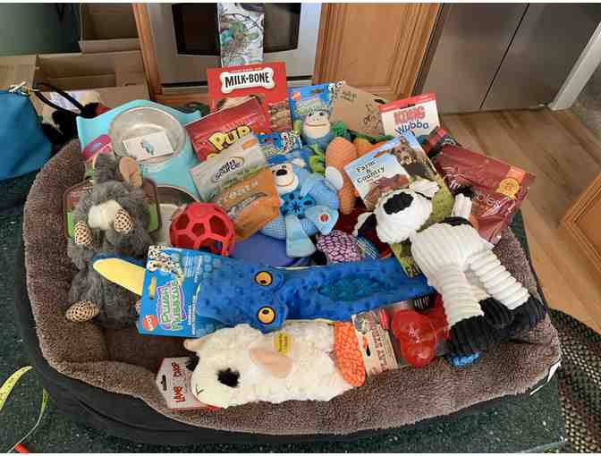 Spoil your pooch with this fabulous box of goodies!! Complete with a 29"x24" plush dog bed (dark brown outside and bottom and light brown inside), dog tray with small water bowl and removable food bowl, cow printed dog bowl with red interior and "Spoiled Rotten Dog Eats Here" printed inside, 6 different furry and squeaky toy babies to snuggle with (cow, lamb, rabbit, carrots, monkey, and snake), a red rubber waffle ball, doggie poop bags and dispenser, box of Milk Bones treats, Wubba Kong Toy, soft ring toy and 4 different treat bags (Fruitables - pumpkin and cranberry flavored, Cabot - sweet potato cheez fries, Pupperoni - original beef flavored, and NutriSource - soft and tender lamb treats).