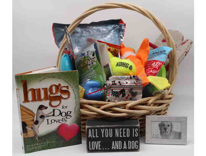 Your dog will hug you when you bring home this basket of toys, treats and more. It includes: