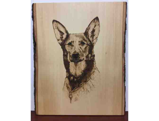Story behind the item: "For a couple of years, I had been wishing to create a wood burned piece for the online auction, but was waiting find the 'right' imagery or concept that I could work into a wood medium. While passing through a hallway on The Seeing Eye® campus, I saw the large portrait of Buddy on the wall. I've seen it several times before, but was struck with how it captured her watchful, loving eyes. I immediately thought, 'That's it! That's the picture!' I enjoyed working the details into the piece from the image and applying textures using my familiarity with German Shepherds as a puppy raiser."