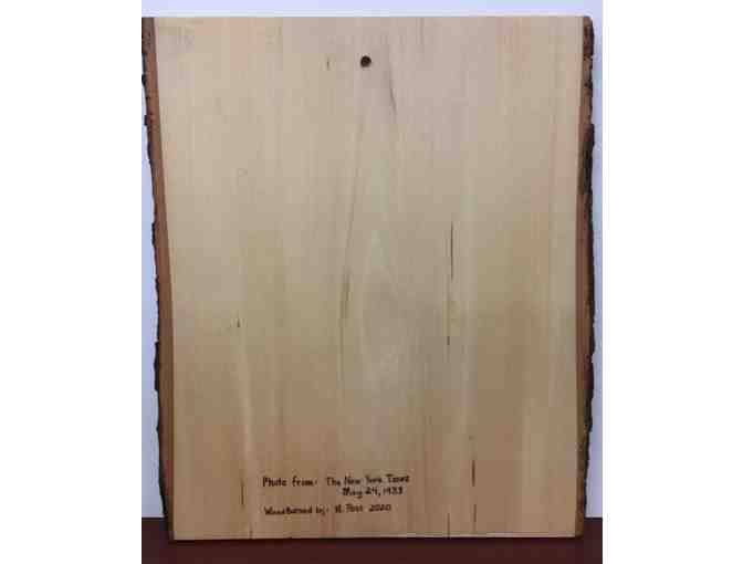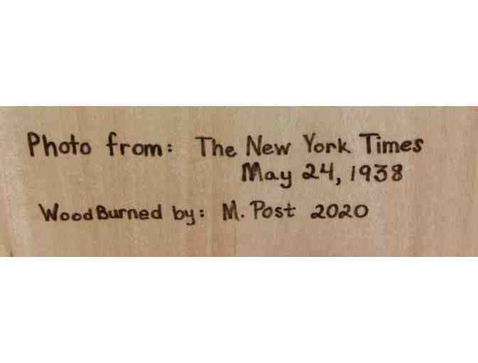 Burnished on back: Photo from: The New York Times May 24, 1938. Woodburned by: M. Post 2020.