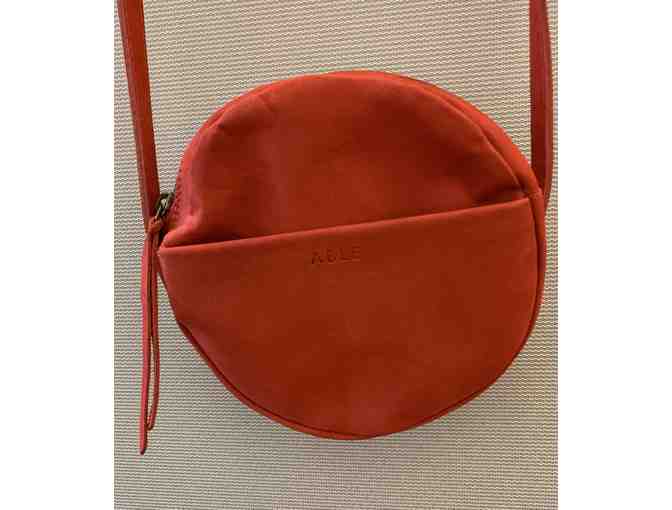 Perfect for a run to the corner store, this fun FashionABLE crossbody is in the shape of a circle with an exterior pocket. The small purse is made from red brushed leather. FashionABLE is a company that sells items made by women who have overcome extraordinary circumstances....helping to end generational proverty.