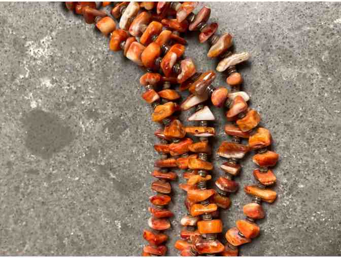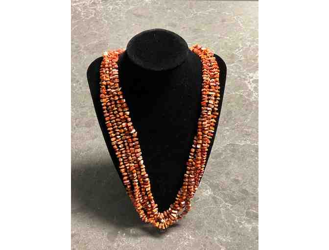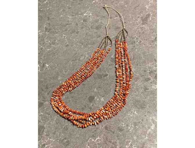 This stunning 5-string Native American handstrung necklace is made entirely of red coral stones on black woven threads. The five strands are tied onto one string closure and the necklace easily slips over the head and hangs 16 inches from the neck. The vermillion colored stones are individually cut and each one is slightly different, though they are all circular and similar in size. This necklace will make any outfit exotic!