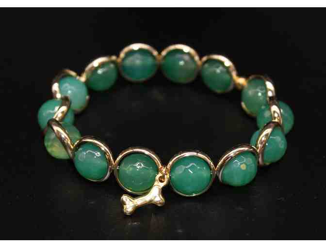 Dress up your favorite outfit and hit the town with this stunning 7" Brett Lauren, Green Sardonyx, Gold-Plated, Stretch Bracelet with Bone Charm. This bracelet includes fourteen round beads in luminous green tones. Each bead is incircled with a gold-plated band.