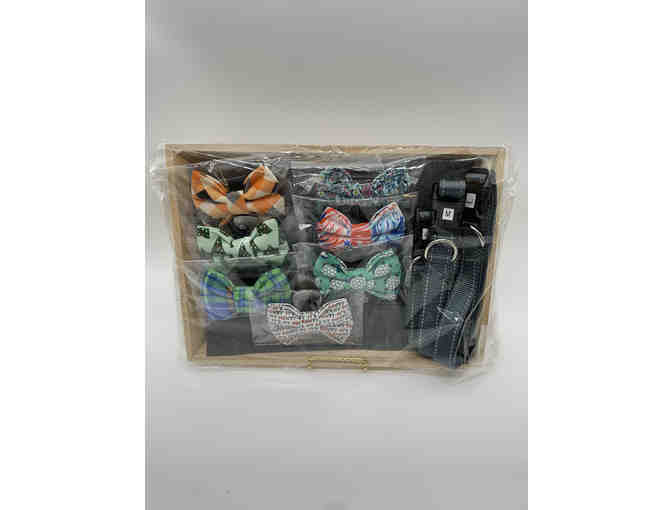 Hilton knows how to “pawty” in style! His favorite things include 7 festive bow ties with velcro attachment for your furry friend and 3 reflective dog collars in a grey-green color in size small, medium and large for your growing puppy!